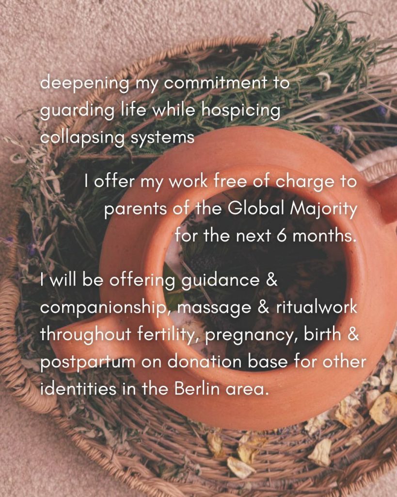 I offer guidance & companionship, body & ritualwork throughout fertility, pregnancy, birth & postpartum on donation base in the Berlin area.
