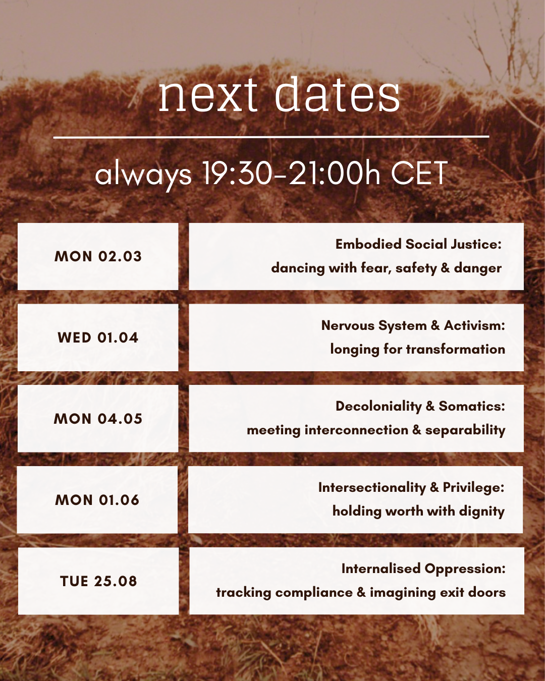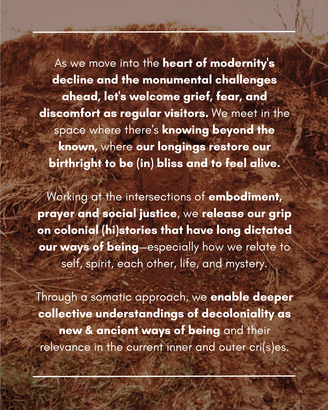 Through a somatic approach, we set the stage for a deeper collective understanding of decoloniality as a new/ancient way of being and its relevance in the current inner and outer crisis(es).